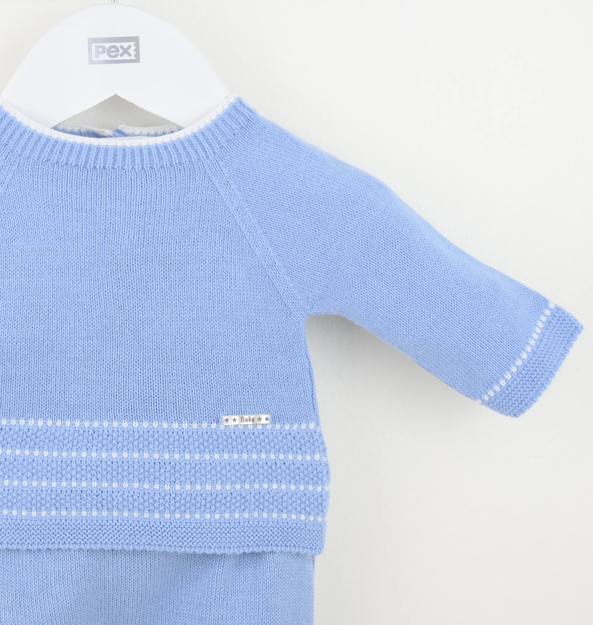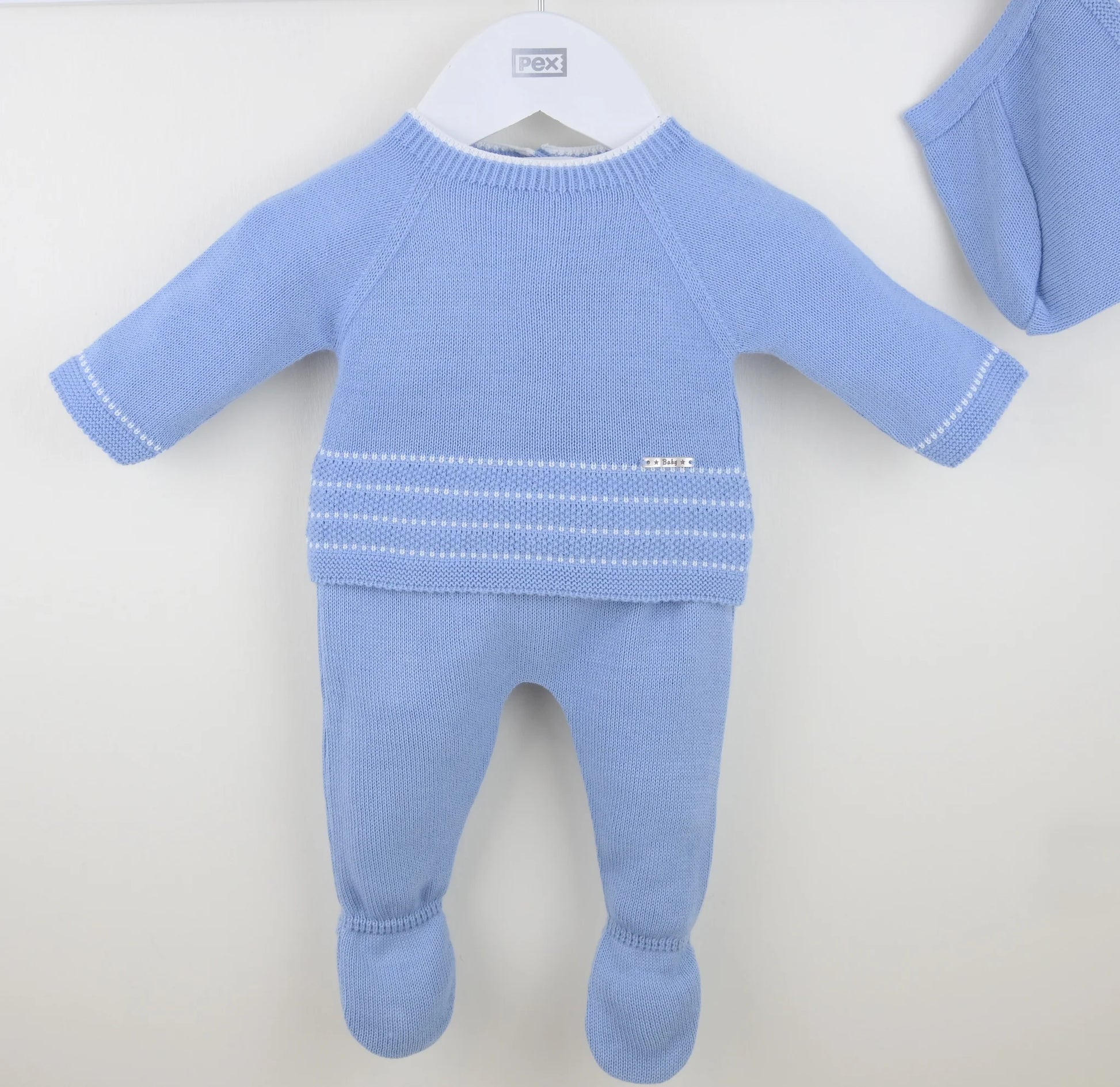 Knitted in gloriously soft dusky blue coloured yarn, this little boys suit is comfy as well as ultra stylish. The smart top has classic textured stripes towards the hem and at the cuffs. There are convenient buttons running down the back. The matching trousers have cosy enclosed feet and a comfortably elasticated waistband. Complete with a matching bonnet.
