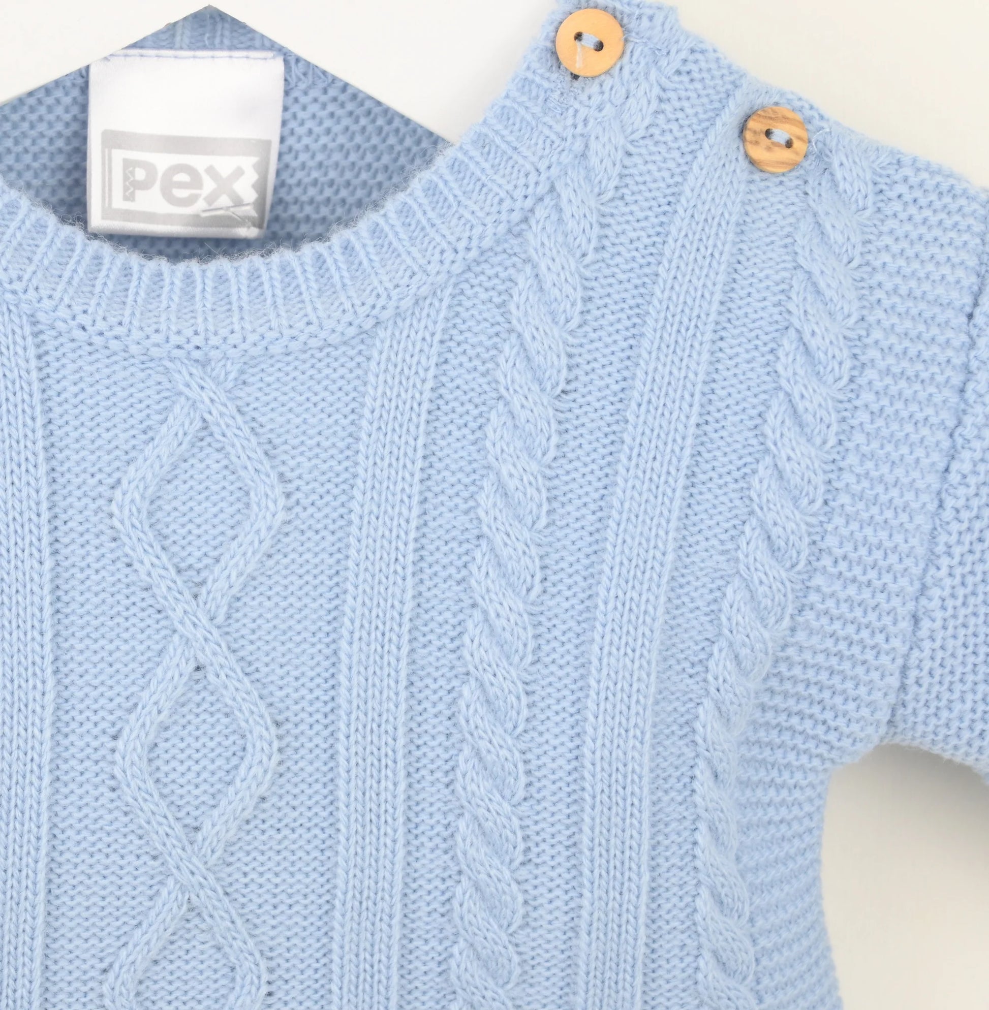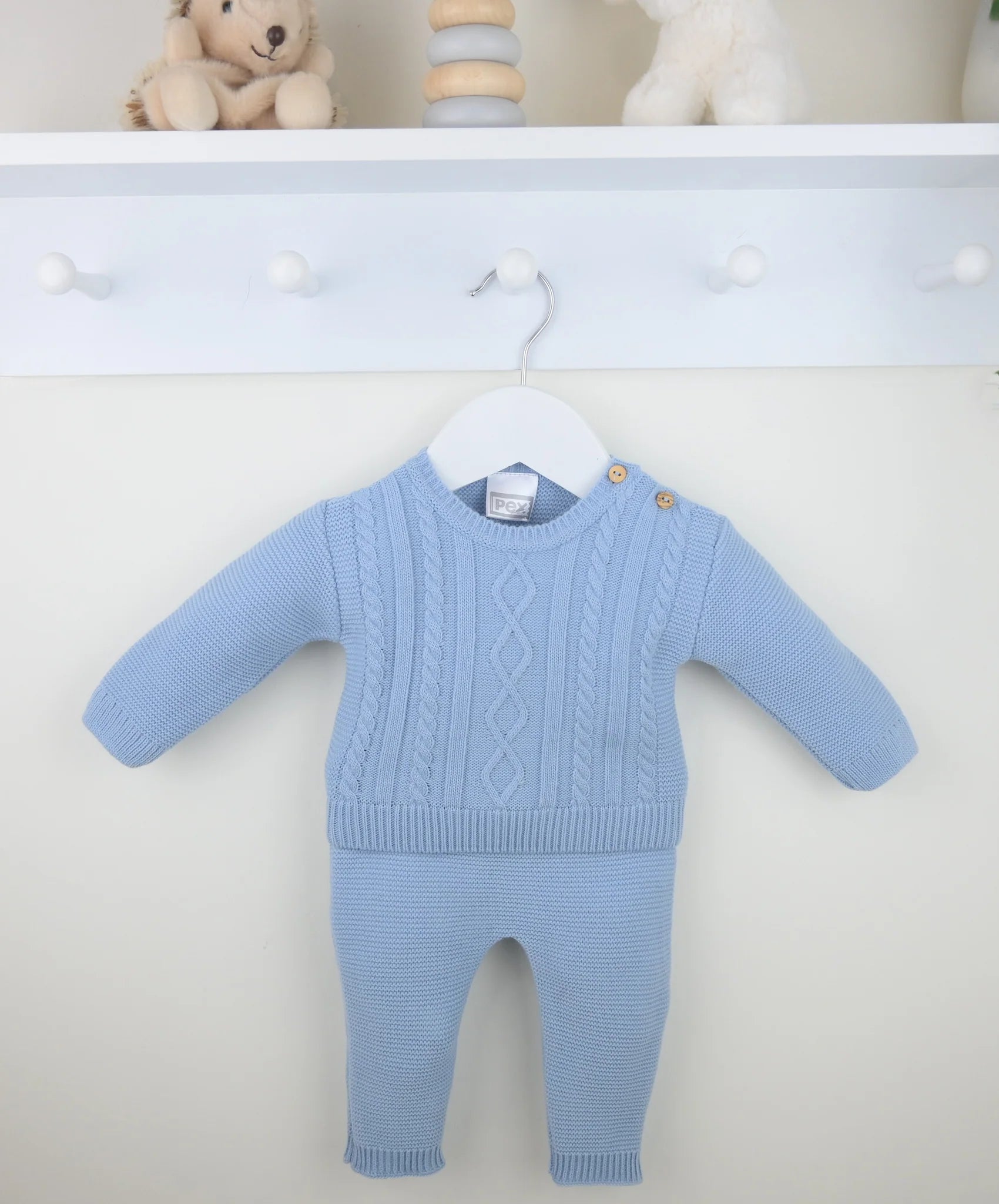 A cosy little two piece outfit, knitted in supersoft yarn in a lovely dusky blue shade. The top has smart textured cable knits and two cute wooden buttons at the shoulder. With a matching pair of trousers that have a comfortably elasticated waist. Ultra comfortable and very stylish!
