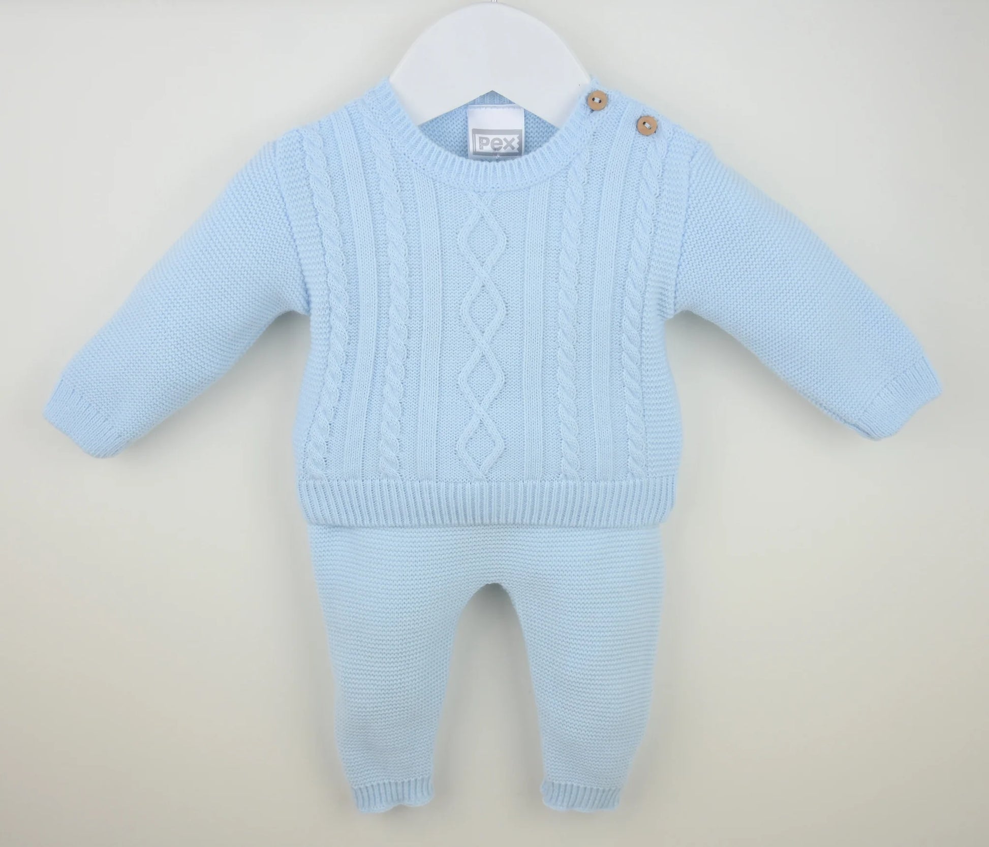 A cosy little two piece outfit, knitted in supersoft yarn in a lovely pastel blue shade. The top has smart textured cable knits and two cute wooden buttons at the shoulder. With a matching pair of trousers that have a comfortably elasticated waist. Ultra comfortable and very stylish!
