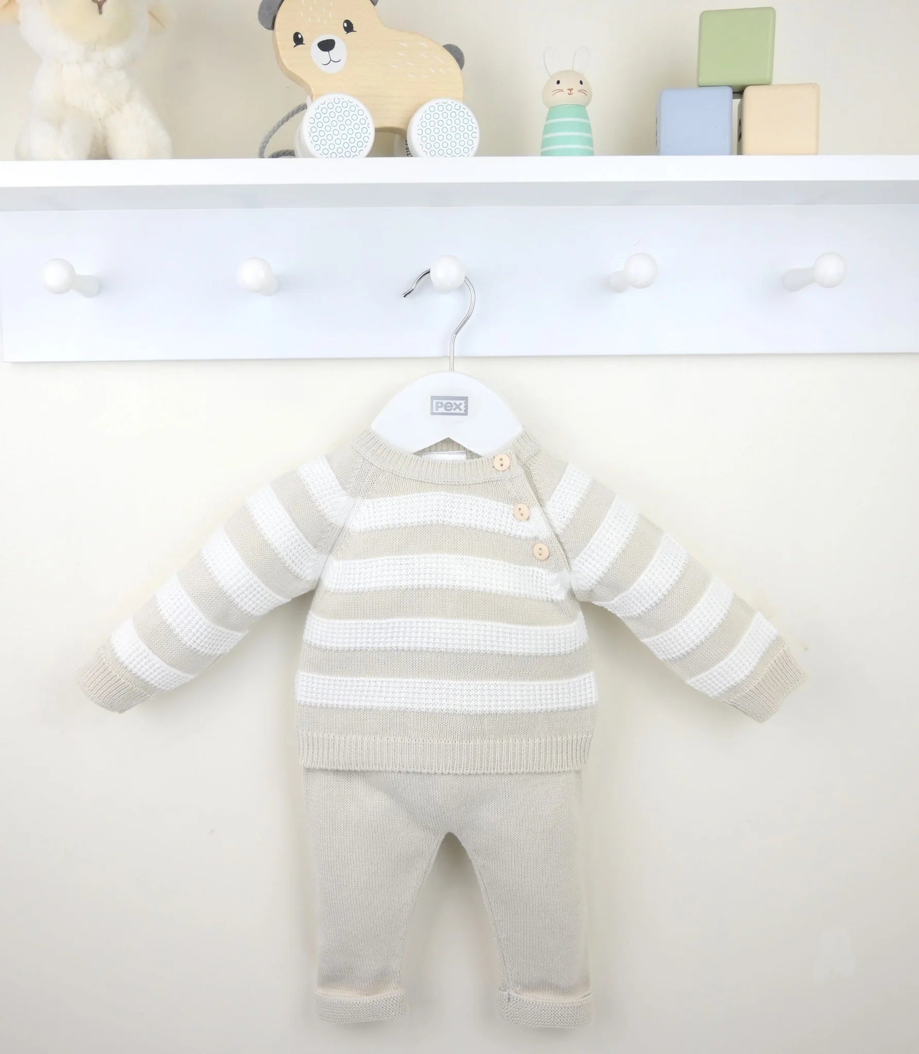 A fresh little baby boys suit, knitted in a supersoft lightweight yarn. The top has smart textured knit white stripes with feature button opening at the left shoulder. The matching trousers are again softly knitted with a comfortably elasticated waistband and contrast knit turn ups at the hem..