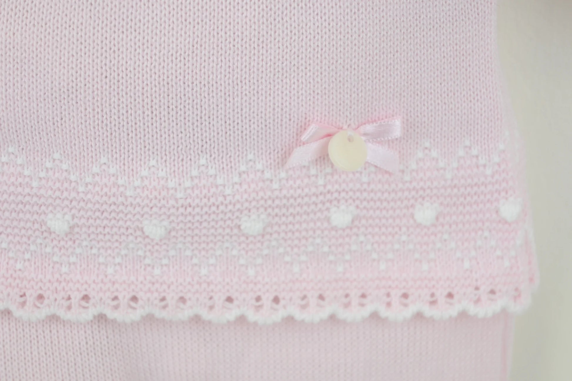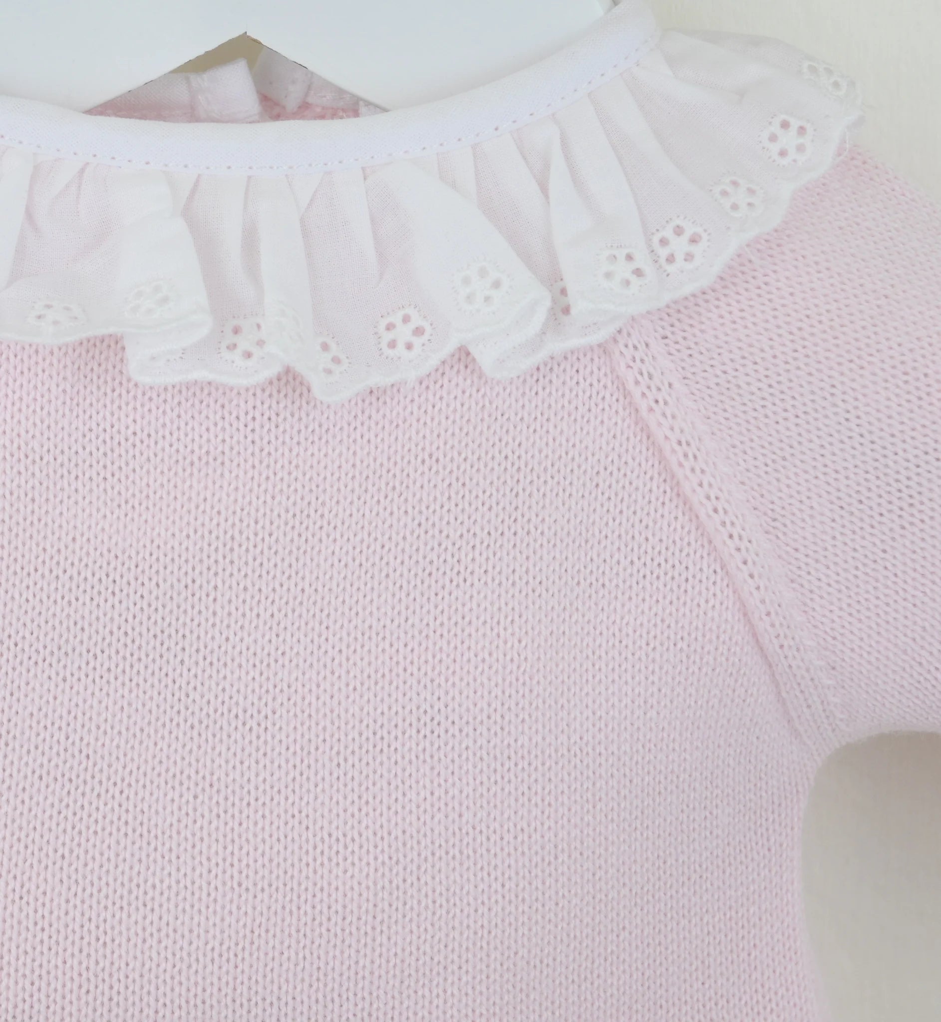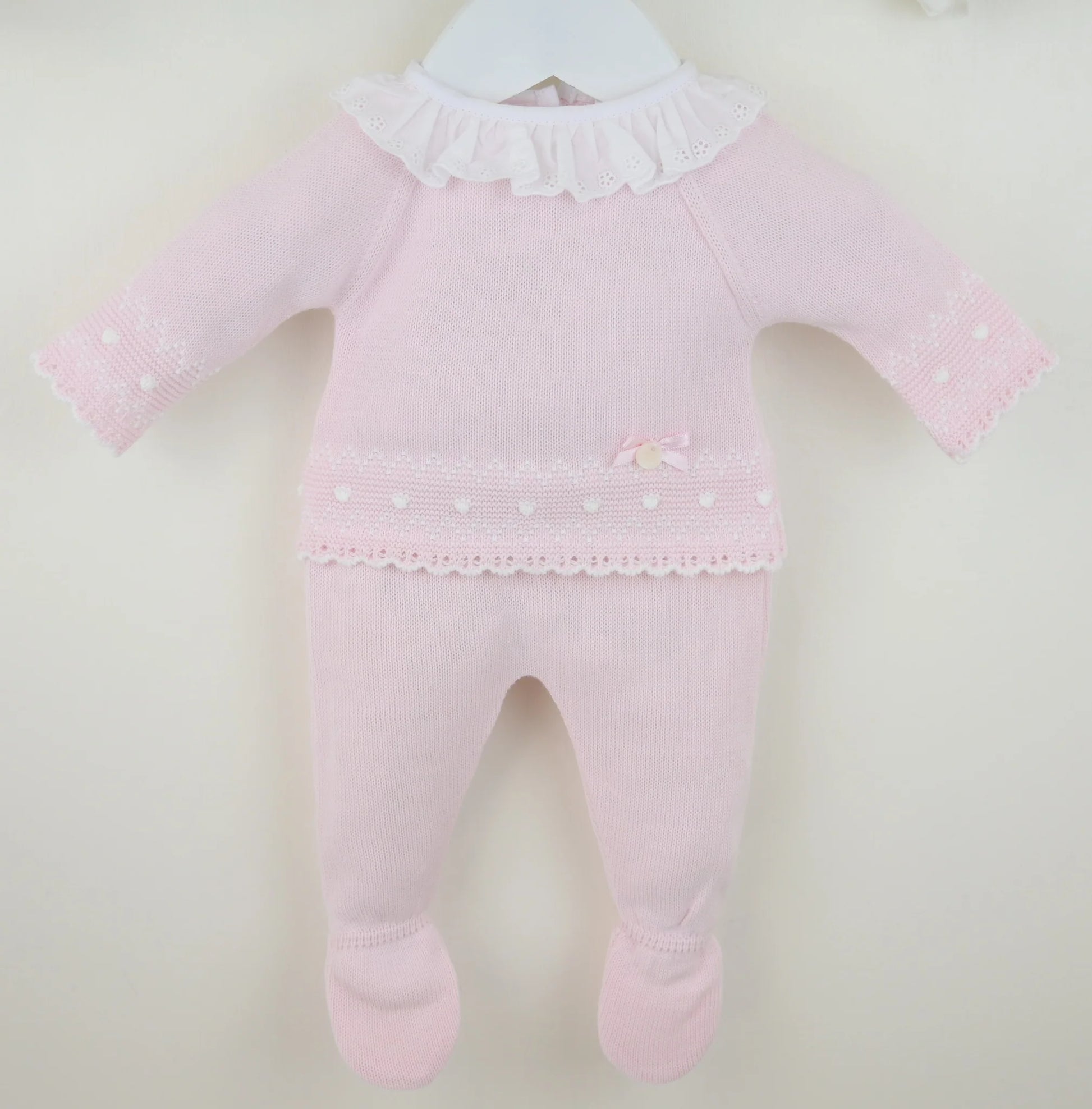 A gorgeous baby girl's knitted outfit in pretty pastel pink yarn from Pex. The top has lovely textured scalloping to the hem and sleeves and an elegant white lace trimmed collar. To the back there are convenient buttons. The matching bottoms have cosy enclosed feet and a comfortably elasticated waist.