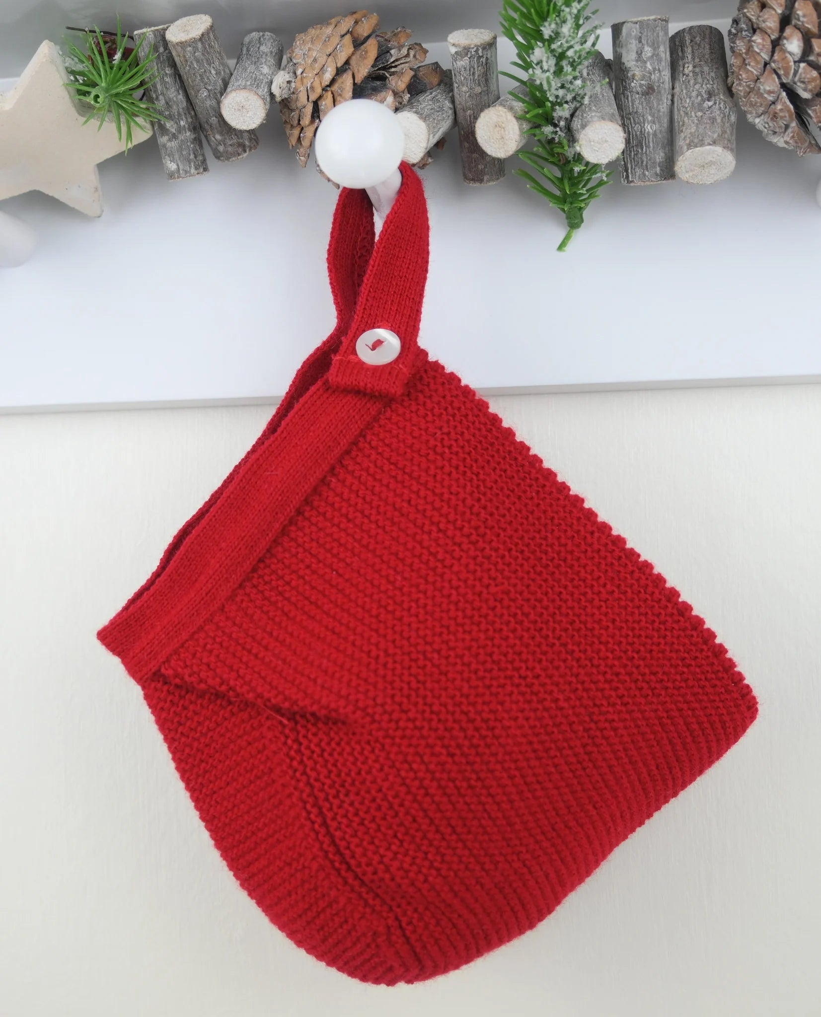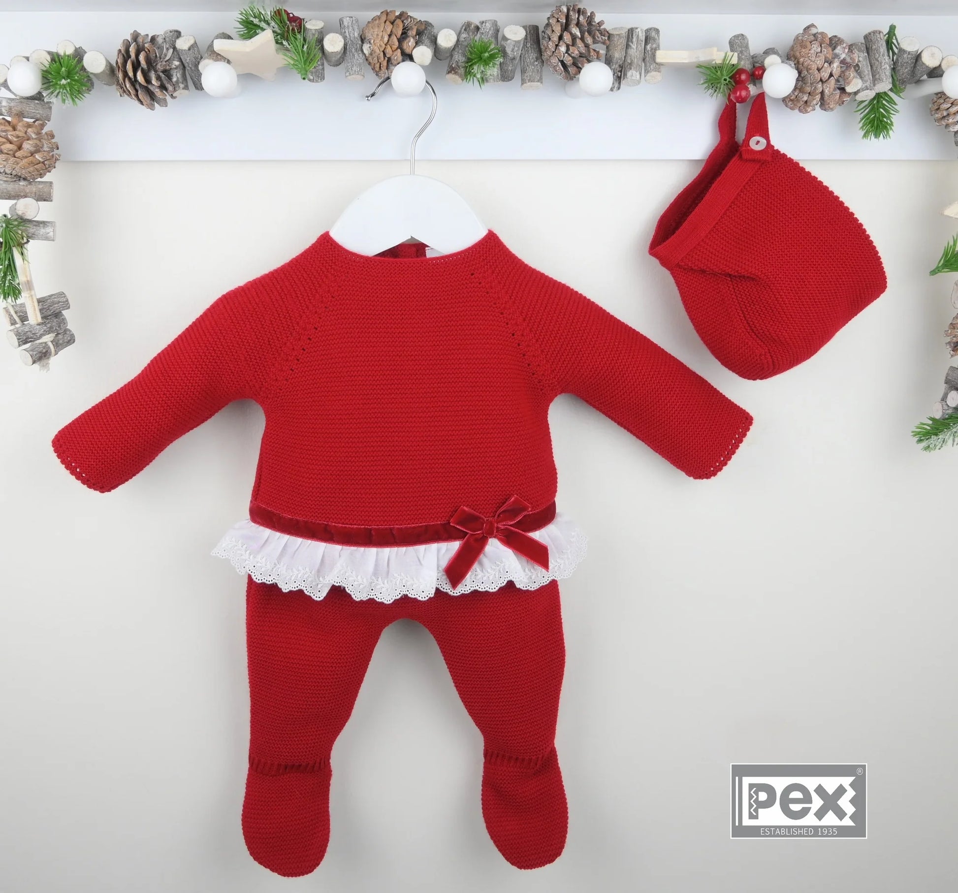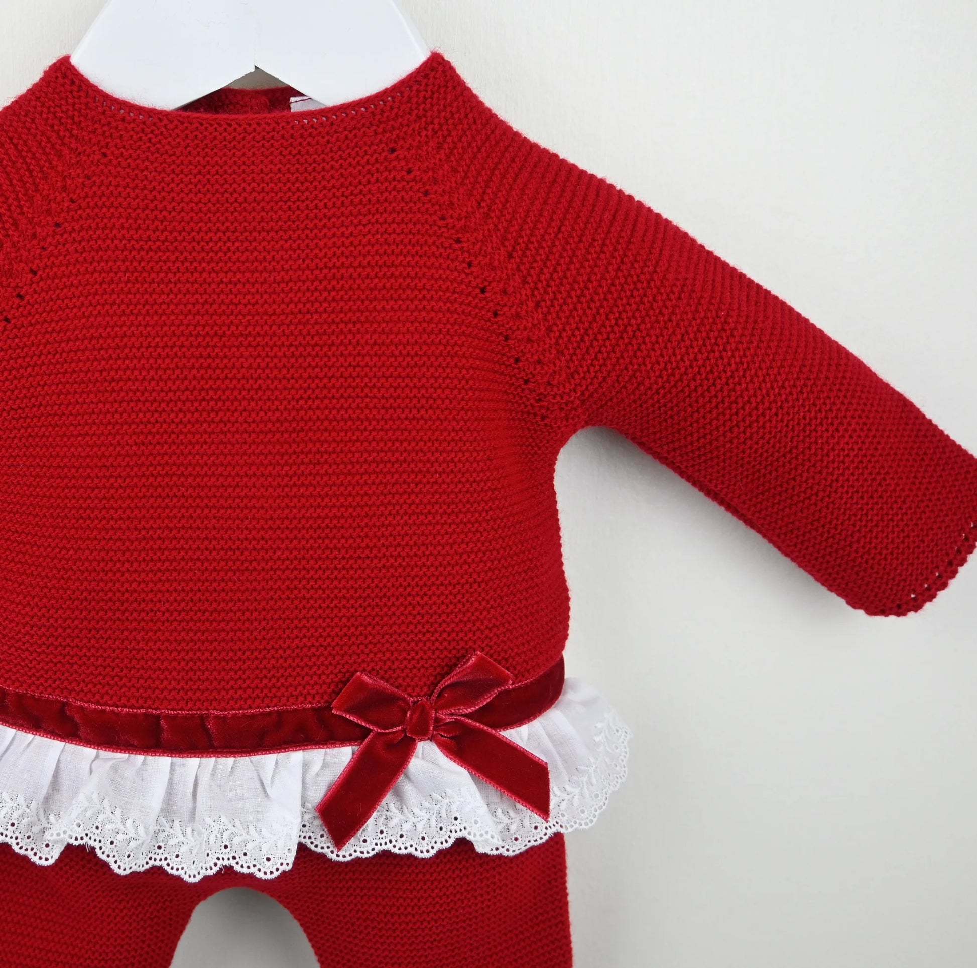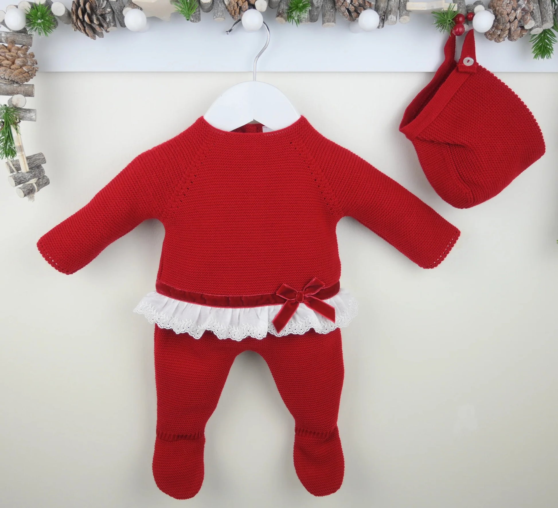 This irresistible 3 piece suit is made in the softest rich red yarn. It's top has been gently knitted and has a stunning velvet ribbon trim and lace hem. With a matching pair of elasticated waist trousers that feature cosy feet. Topped off with a gorgeous knitted bonnet!